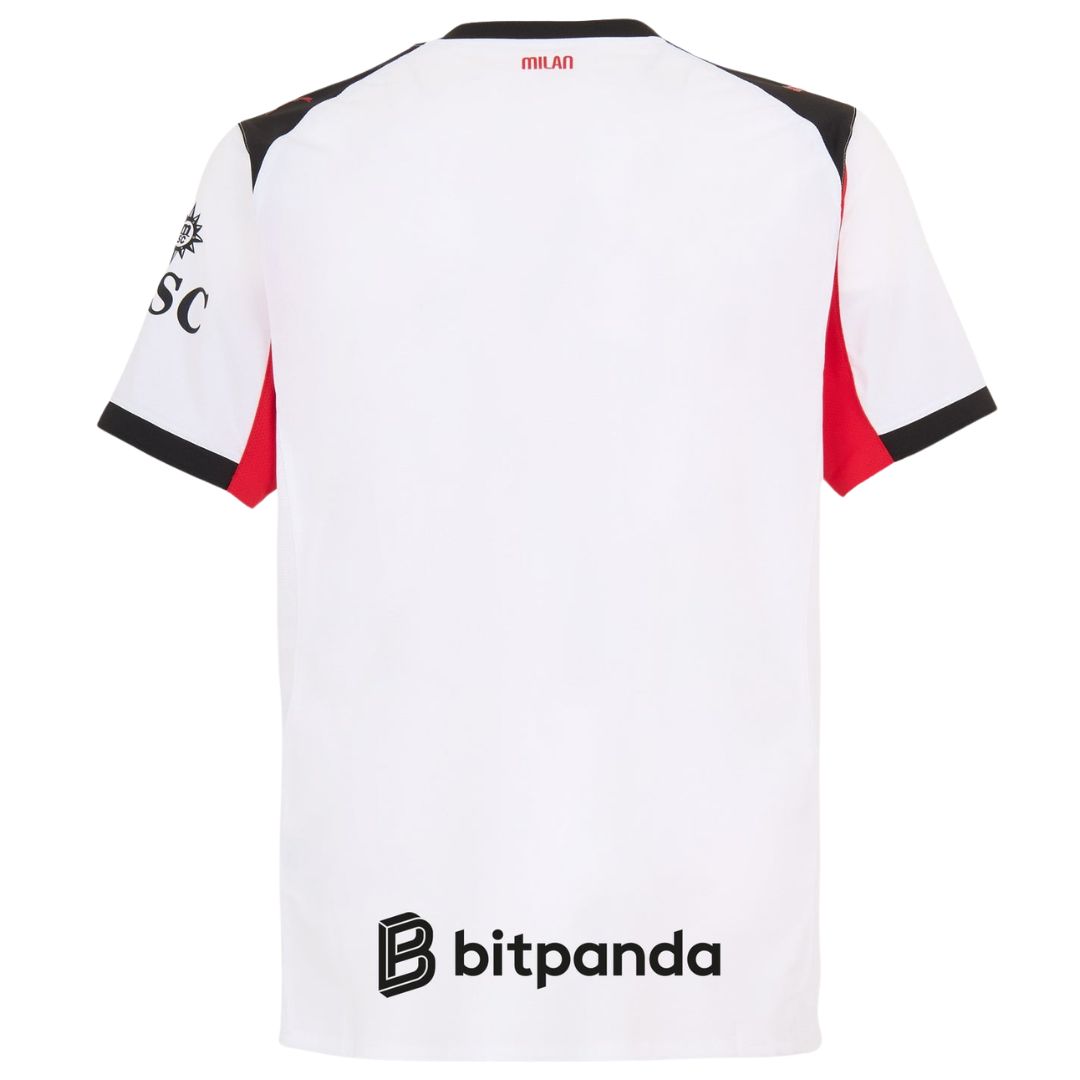 AC Milan Away Jersey 25-26 lands with pure impact. Crisp white base meets sharp red and black accents. The iconic Diavoletto devil sits proud on the chest.