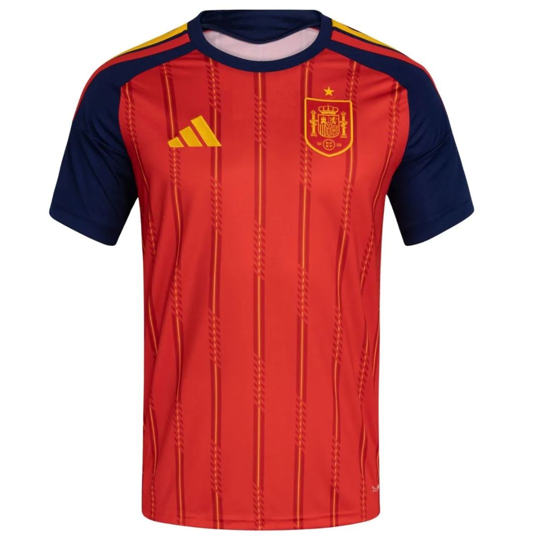 - Authentic replica of Spain 2026 FIFA World Cup Jersey home kit in vivid red with flag-inspired yellow pinstripes and navy accents
